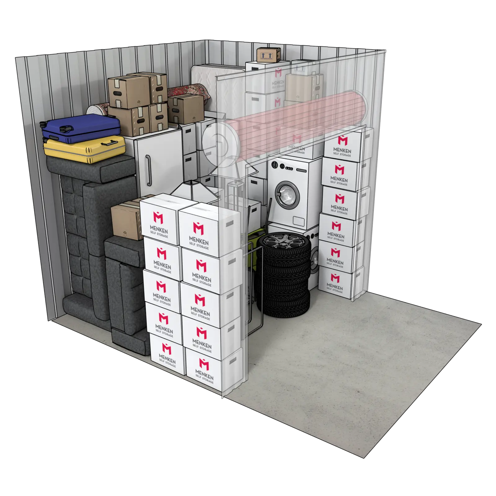 Bij Menken Self Storage hebben wij opslagruimtes van verschillende maten. Bij de unit Large hebben wij opslagruimtes van:
